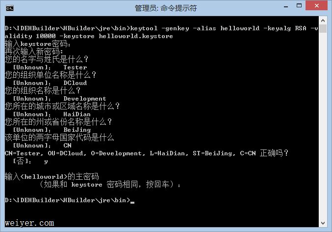 (使用DCloud公用证书可忽略此操作)确保电脑上安装了JRE,我们将使用JRE自带的创建和管理数字证书的工具Keytool。使用以下命令生成证书: