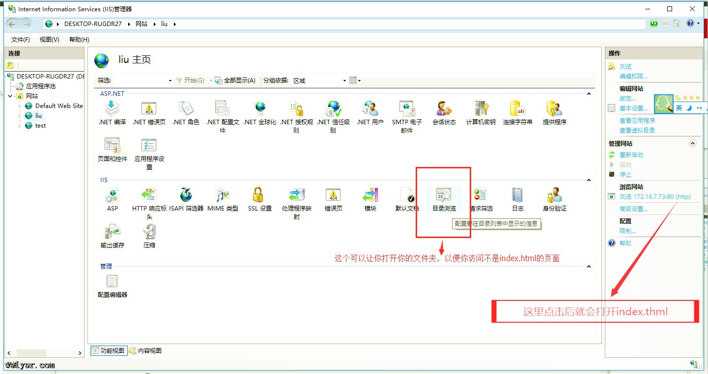 有时候你想输入(192.168.1.1/liu)这种网址,那么你就需要设置虚拟目录了。如上图你可以右键点击左上角test的网络。弹出 ==添加虚拟目录==别名:就是liu了。物理地址可以不是主目录的地址。之后输入(192.168.1.1/liu)就能访问你的另一个目录下的网页了。