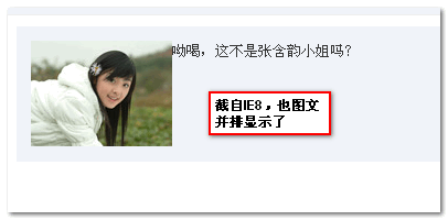 很简单,前面一个标签是浮动元素,后面的是block水平的绝对定位元素,结果IE8+,以及现代浏览器文字与图片重叠;但是IE6/IE7浏览器确是并排显示的。如下截图示意: