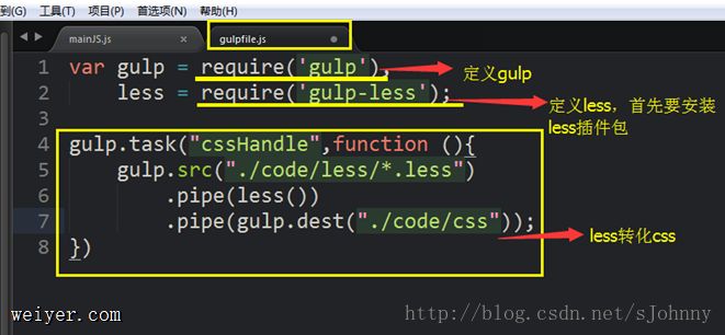 安装完成后,我们只用在gulpfile.js里加载gulp 和 less 模块即可