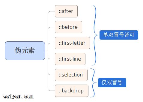 有时你会发现伪类元素使用了两个冒号 (::) 而不是一个冒号 (:),这是 CSS3 规范中的一部分要求,目的是为了区分伪类和伪元素,大多数浏览器都支持这两种表示方式。