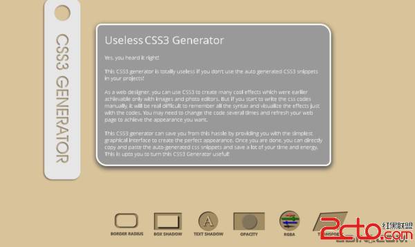这个CSS3的代码生成器和一般的CSS3代码生成工具不太一样,它使用了视差滚动的方式来展示内容,并且提供了自定义的选项,可以动态的生成你需要的CSS3代码。超酷超有型!