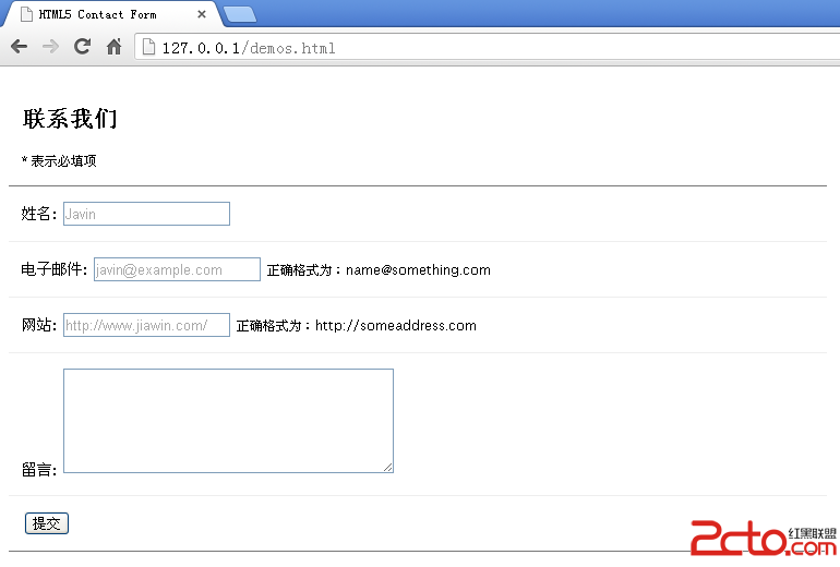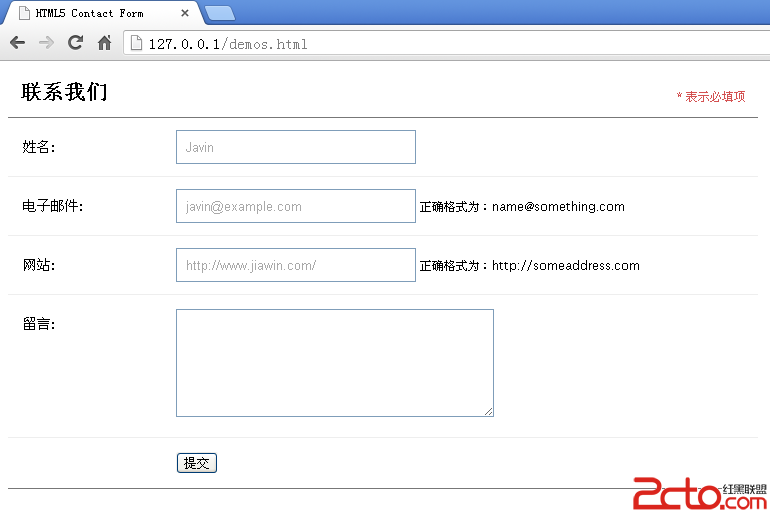 我们在本例中到现在为止,设置的表单字段都默认为type="text",现在我们需要改变“电子邮箱”和“网站”这两个为:type="email"type="url"。