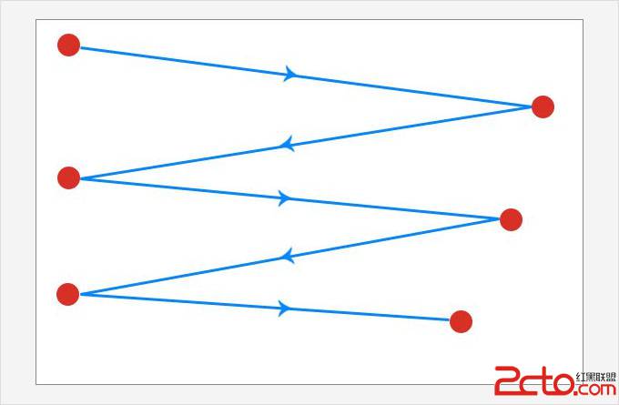 每当你不是很专注时,你的视觉流向很自然的就会呈现为“之”字形。除非有对比度更高或者更重要的元素“召唤”你,不然你的视线就将会遵循上图的模式。你还会发现,这种模式看起来和F型布局非常相似,并且用户会在红色端点有短暂的停留。