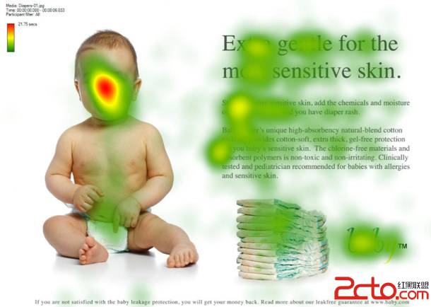 他们以婴儿尿布零售商网站作为例子在106位研究对象上做了一项眼动研究。接下来你可以看到2张图片。当图中婴儿的脸是面对访客时,大部分的人会把焦点放在他的脸上,留下诸如可爱,甜美等印象。